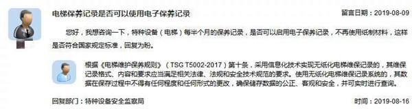 问:您好,我想咨询一下,特种设备(电梯)每半个月的保养记录,是否可以启用电子保养记录,不再使用纸制材料,这样是否符合国家规定标准,回复为盼。