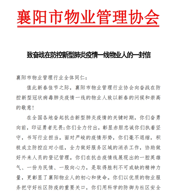 1月31日,发布《致奋战在防控新型冠状病毒肺炎疫情一线物业人的一封信》肯定了我市物业人在抗击病毒一线面对严峻疫情,展现出的一腔英雄气、一份为民情、一股向心力,鼓励物业服务企业把疫情防控作为当前最紧迫的政治任务来抓,以高度的使命感和责任感,积极投身到防控疫情的战斗中去,团结一致、同舟共济,共同打赢这场疫情防控阻击战!