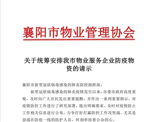 1月29日,随着疫情形势的严峻,针对我市物业服务企业普遍面临防护物资匮乏的问题,市物协发布《襄阳市物业服务企业请求防护物资爱心捐助》恳请有关单位、爱心人士和广大居民业主伸出援手,与全体物业人一起抗击疫情,共同守护我们美好的家园。
