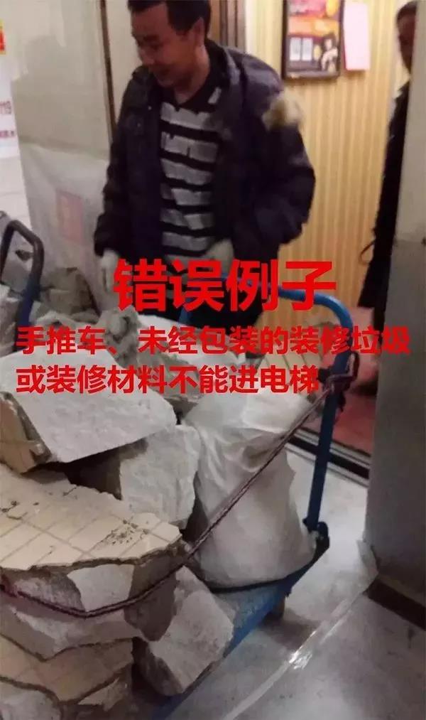 建议邻居装修时,用大袋子把这些垃圾整理好,再放入电梯内,当然也要考虑一下电梯的承重,不要超载。温柔一点对电梯。