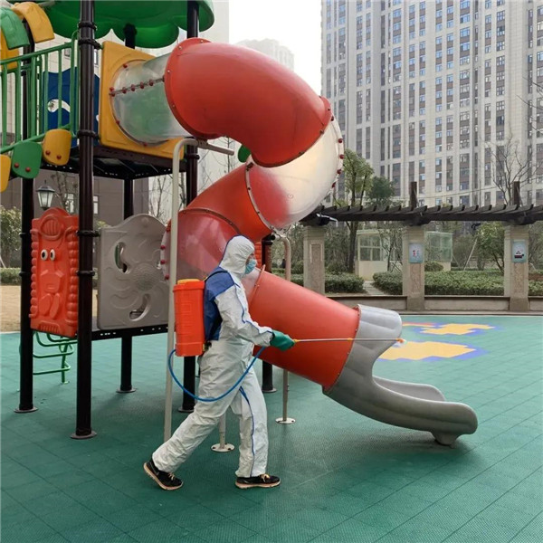 小区内外地面、楼道、垃圾桶、以及公共区域全面消毒消杀。