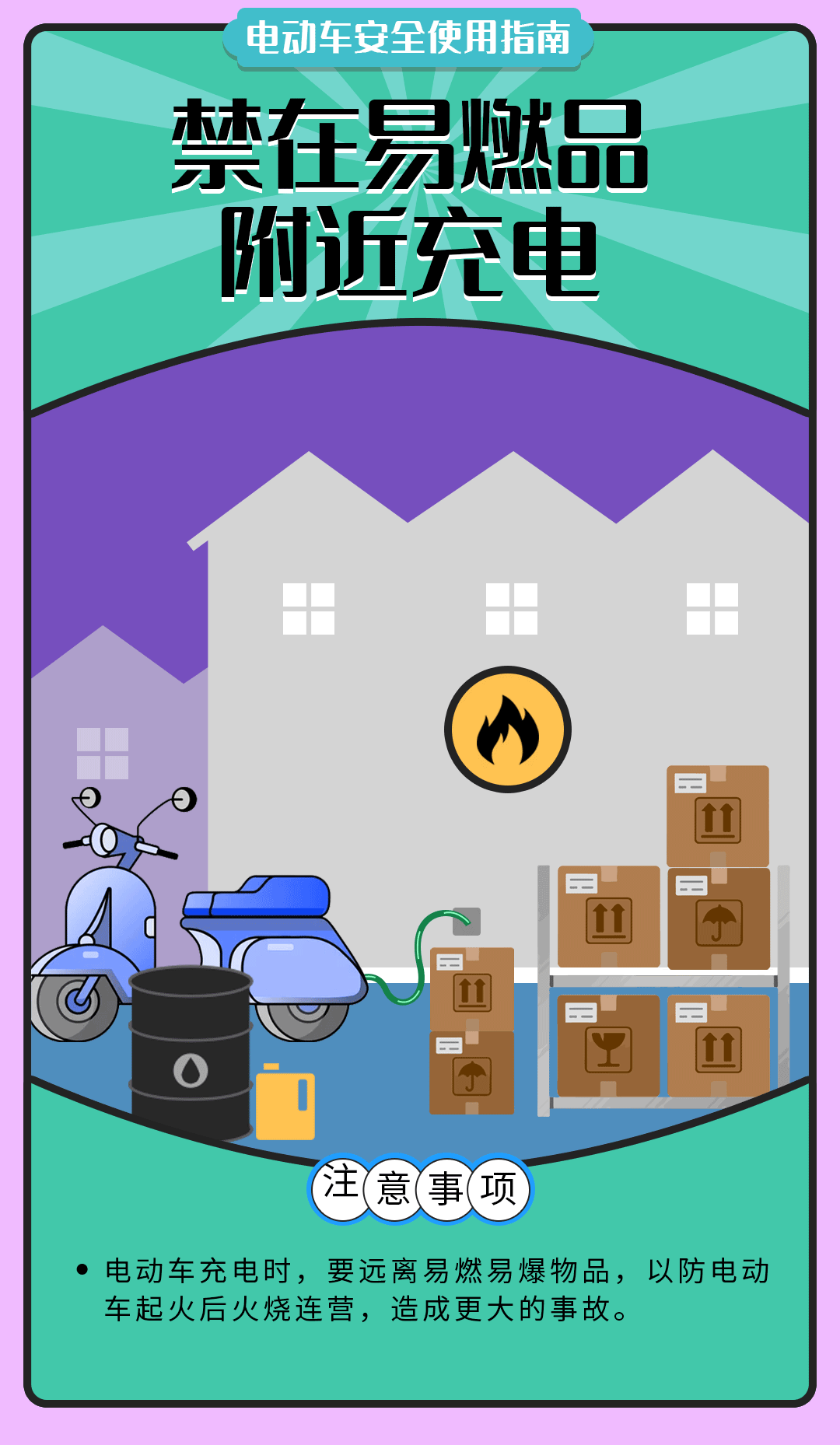 电动自行车因其方便快捷 成为许多人的出行选择 但由此带来的安全风险 也在不断增加 “ 去年电动车及电池火灾近1.8万起 据统计,去年全国共接报电动自行车及其电池故障引发的火灾近1.8万起、死亡57人。 电动自行车火灾多发的原因主要是电动自行车的电池低劣,用户随意改装,还有长时间充电等。 事故令人痛心 案例令人警醒 电动车安全使用指南 一起来了解 ↓↓↓ 《高层民用建筑消防安全管理规定》里 也提及关于电动车存放等的相关规定 以及违反规定的行为及处罚。 《高层民用建筑消防安全管理规定》 第三十七条 禁止在高层民用建筑公共门厅、疏散走道、楼梯间、安全出口停放电动自行车或者为电动自行车充电。 鼓励在高层住宅小区内设置电动自行车集中存放和充电的场所。电动自行车存放、充电场所应当独立设置,并与高层民用建筑保持安全距离;确需设置在高层民用建筑内的,应当与该建筑的其他部分进行防火分隔。 电动自行车存放、充电场所应当配备必要的消防器材,充电设施应当具备充满自动断电功能。 第四十七条 违反本规定,有下列行为之一的,由消防救援机构责令改正,对经营性单位和个人处2000元以上10000元以下罚款,对非经营性单位和个人处500元以上1000元以下罚款: (一)在高层民用建筑内进行电焊、气焊等明火作业,未履行动火审批手续、进行公告,或者未落实消防现场监护措施的; (二)高层民用建筑设置的户外广告牌、外装饰妨碍防烟排烟、逃生和灭火救援,或者改变、破坏建筑立面防火结构的; (三)未设置外墙外保温材料提示性和警示性标识,或者未及时修复破损、开裂和脱落的外墙外保温系统的; (四)未按照规定落实消防控制室值班制度,或者安排不具备相应条件的人员值班的; (五)未按照规定建立专职消防队、志愿消防队等消防组织的; (六)因维修等需要停用建筑消防设施未进行公告、未制定应急预案或者未落实防范措施的; (七)在高层民用建筑的公共门厅、疏散走道、楼梯间、安全出口停放电动自行车或者为电动自行车充电,拒不改正的。 温馨提醒 为了自己和他人 严禁在建筑内的楼梯间、疏散通道 安全出口、门厅等公共区域 停放电动车或充电!