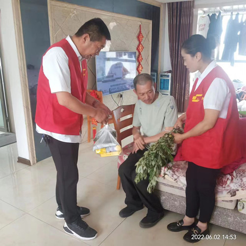 “兄弟,你好!看着你这身体状况恢复得还不错嘛,要坚持进行康复锻炼,保持美好的心情,明天就是端午节,给您送点粽子,祝您节日愉快!”韩经理一边说着,一边把慰问品递到残疾人郭军政手上,郭军政接过粽子,激动地说:“真的非常感谢你们来看我,把我挂在心上,让我感受到了温暖与关怀!”
