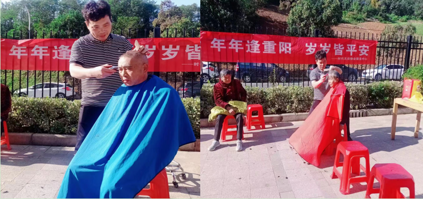 义务理发送关怀 爱心传递,从“头”开始。特邀专业理发师们满足老人的理发需求,理发师凭借娴熟、精湛的技术为他们修剪出各自满意的发型,精气十足!看着镜子中的新发型,业主们露出了满意和开心的笑容,纷纷竖起大拇指,为本次活动点赞。 时代天街 上门慰问送温暖 爱心上门,暖意不减。物业工作人员对不能前来参与活动的老年人,逐一登门拜访并送上节日的祝福和慰问。耐心询问着老人的身体状况、生活情况和生活需求,同时向老人们强调,凡是遇到难以解决的问题或困难都可以联系物业服务中心或向对应的客服管家求助,物业工作人员们一定竭尽所能帮助解决。为他们清理了家里的卫生和检查电器设备的安全,用物业人的方式表达对小区老年人的关心和爱护,并将一份份精心准备的礼品送至他们手中。 上门慰问 打扫卫生 维修设备 检查设备安全 此次,山河锦秀物业各项目组织开展的重阳节系列活动,从小区老人的实际需求出发,通过贴心暖心的举措,让他们深切感受到了山河锦秀物业人用心、细心的服务。山河锦秀物业将夯实“红色物业”基础,促进“红色物业”真正发挥服务群众的精神,不断提高物业服务意识和服务水平,给予老年业主更多关怀、提供更细致的服务,构筑和睦温馨的邻里环境。