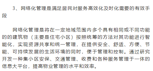 传统的物业管理,由于技术含量不高,只能是一个劳动密集型的行业。面对现代科技的迅猛发展,以楼宇智能化、宽带社区网络为代表的高新技术在现代建筑中的广泛运用,物业管理行业赖以生存和发展的各种物业“硬件”发生了前所未有的变化。如何适应这一发展潮流,并实现物业管理行业的科技转型,是摆在所有业内人士面前的一道“难题”,有效破译这一“难题”的“密码”便是建立“网络大平台”,实现网络管理现代化。